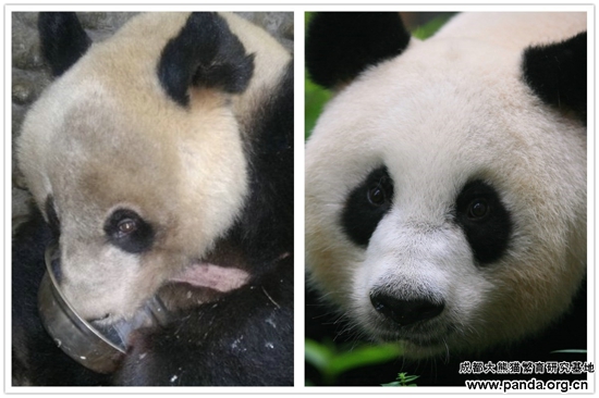 After resuscitation for six days and nights, Longlong, who hadn’t drunk any water and even shocked and stopped breathing for many times, started to take food. After being nursed for two years, Longlong weighs 106 kg now, and his sunken cheeks were transformed to a round face. What a great change! Now he is spending his remaining years in comfort in the base. We wish him good health and a long life. Let’s see some pictures of Longlong!
