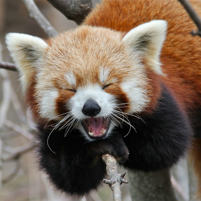 Panda’s World is not only black and white. There is another kind of panda called "Red Panda", which is commonly known as the "Lesser Panda". Red pandas look like raccoon since they have annular stripes on their long and hairy tails. Red pandas are very cute not only because of their appearance,but also because they are very famous "expression emperor"!If you observe red panda carefully,you will find that they like to spit their tongues very much. Many people may think that they must be acting cute, but in fact, they are just doing the"detection " work.