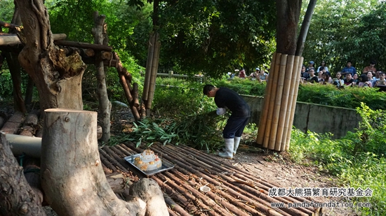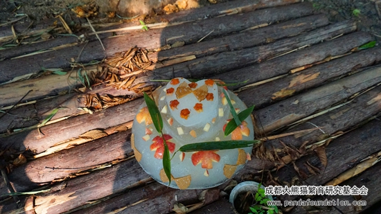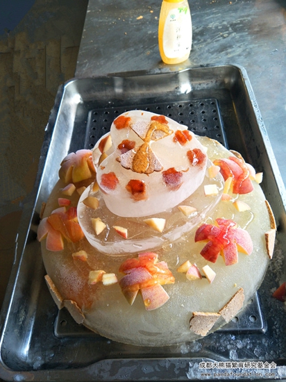 Early in the morning, my keeper has brought my birthday cake from Panda kitchen. This beautiful cake, frozen for at least 3 days, is covered with my favourite food: apples, steamed bread and honey.