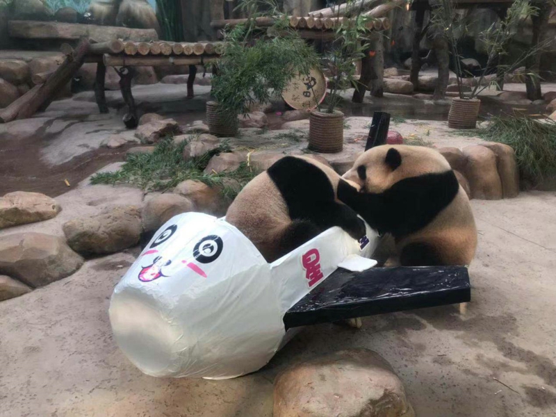 In order to give them a unique birthday party, the keepers made great efforts to prepare the party. They made a good-looking ice birthday cake which was decorated with tasty fruit for them. The twins finally reunited again on a special day after a long time apart. Besides the birthday treats, Nan Tong Wild Zoo also prepared some new enrichment toys for them as birthday presents, and also had invited some people who had the same birthday as them to come to enjoy the party with pandas.
