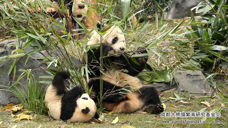 Xiao Yatou is not a first time mother. She is with her cubs, Xiao Xin and Qing Qing in a playground. She is gentle and approachable when breastfeeding. She always patiently teaches skills, like eating bamboo shoots and climbing trees, to her cubs. When the two cubs wrestle mischievously, they will also come to persuade her to play, one will pull her ears, while one will pull the back of her neck., How harmonious and warm the picture is when she eats with her two cubs. But Xiao Yatou loves to eat very much, it's impossible even for her favorite daughter, Xiao Xin to take bamboo shoots from her. Xiao Yatou, with a paw against Xiao Xin's face, will keep her on the side away from her food. By the way, this is a conventional tactic that many giant panda mothers will use.