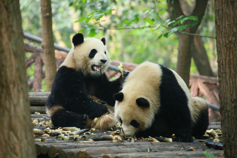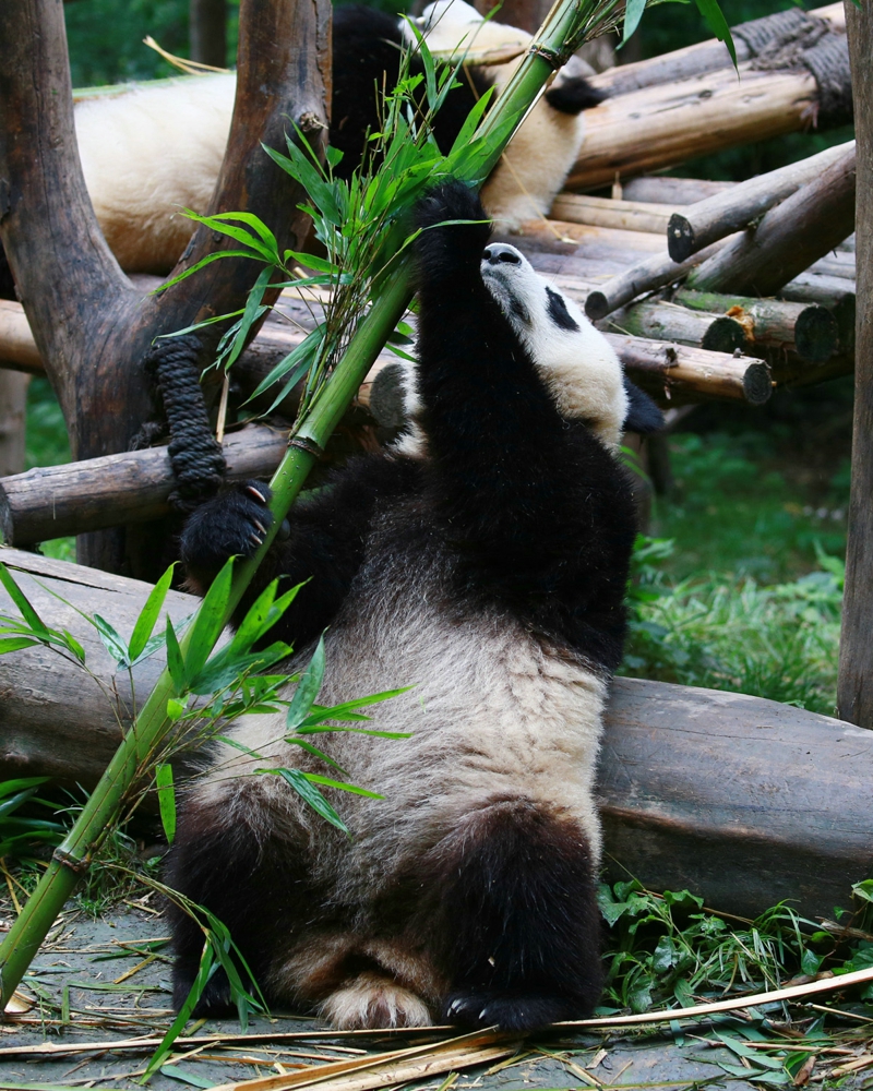 Early in the morning, Si Nian and Si Junjun, Ke Da and Ke Xiao wereeating sweet bamboo shoots, chatting with each other in the young-cub enclosure.