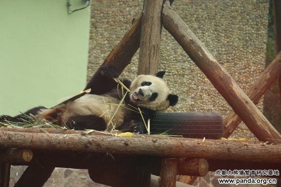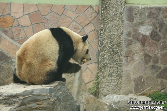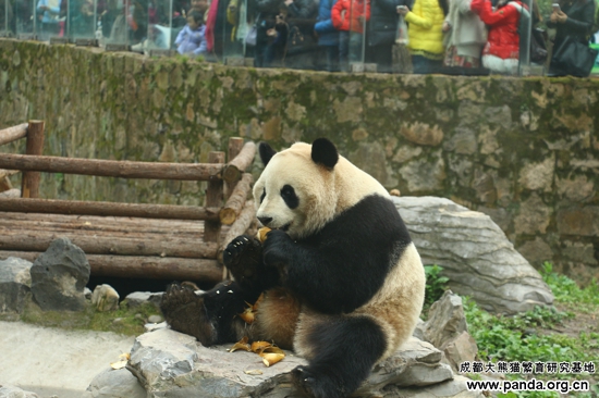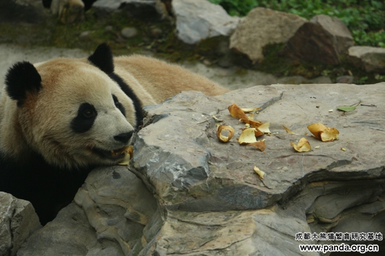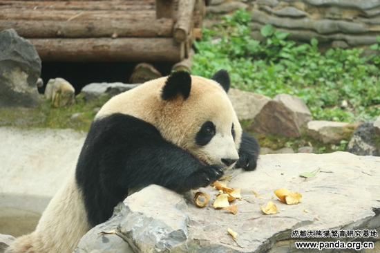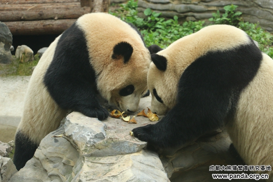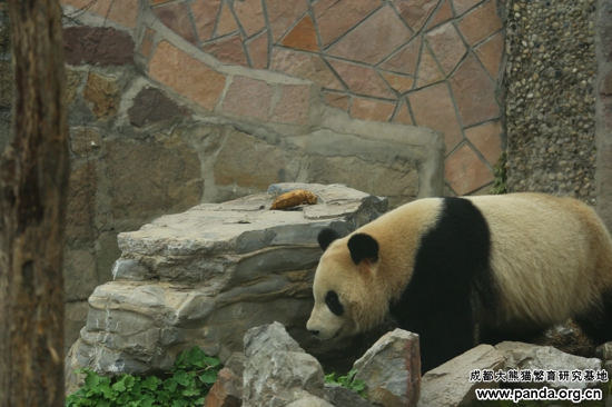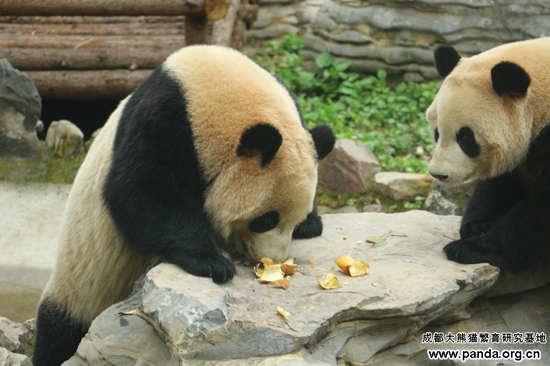 双欣と双喜の食を探す能力を伸ばすために、飼育員はわざと笋を石に乗せて、探してもらう。