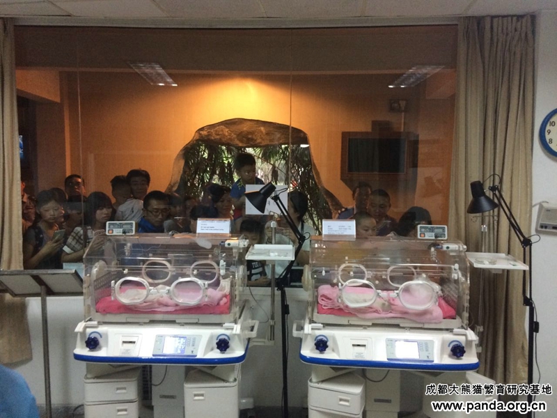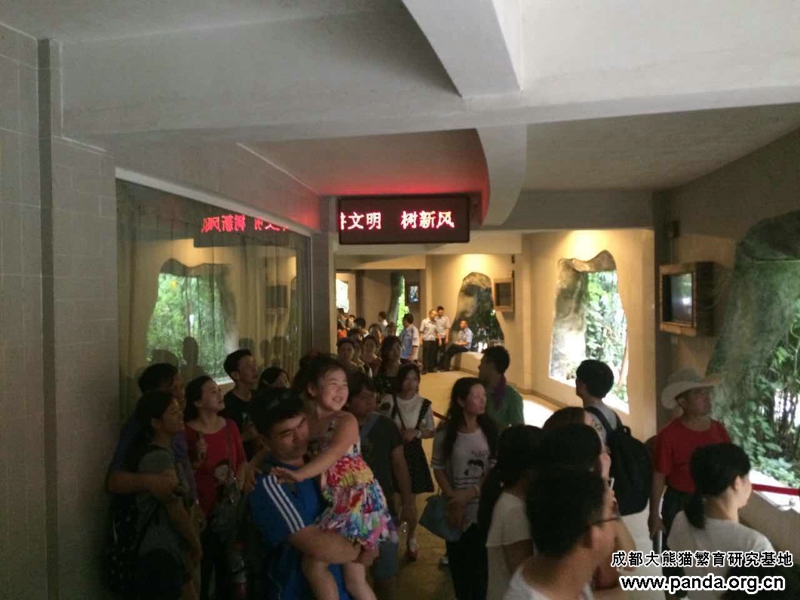 パンダ産室を見学している観光客ら