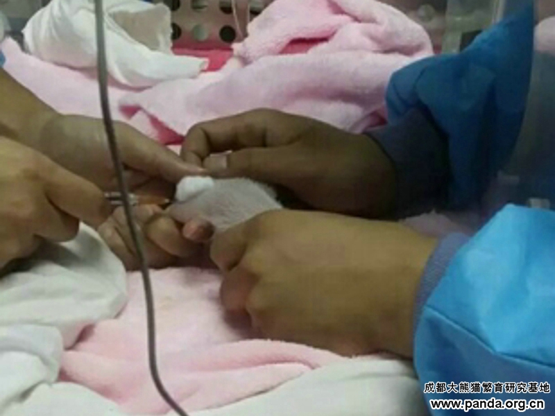 妹のほうが軽いから、姉をしばらくコリンに預けて、妹だけを飼育室に残し人工飼育することになりました。しかし、当日の午後、ママと一緒にいた姉が全くミルクが飲めず、ますます元気がなくなっているのを見たからママの胸から取り出してチェックした結果、頭に少しうっ血があり、右側の口元にも2ミリメートルの裂傷があるから、口が完全にクローズできないからミルクが飲めないのに気づきました(全てはママに咥えられた時によるものだとされています)。同じ原因で人口哺乳も無理だから、飼育員よりミルクを舌根まで絞ってから飲むしかできません。こうした飲み方ではミルクが肺まで吸い込まれる恐れがあるから、これを防ぐために、2ミリリットルのミルクを飲んでも40、50分ぐらいかかります。また傷口も消炎などちゃんとした手当がされたから、何日をしてから、お姉さんはまた元気になりつつ、ママのコリンの暖かい懐に戻ってきました。