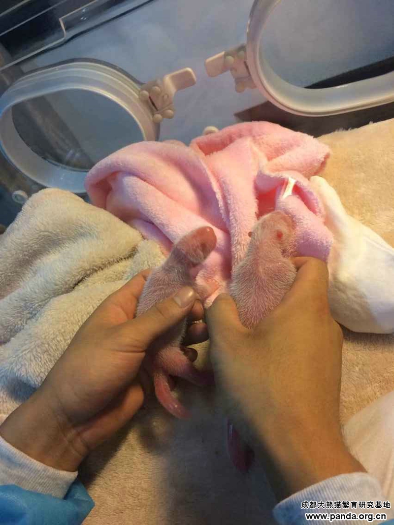 パンダ基地の動物管理部部長の呉孔菊氏の紹介によると、6月25日から減食し始まったショウヤートは、毎日パンダケーキと笹を少なめに食べていました。7月25からいらいらしていたショウヤートは頻繁に動いたり自分の外陰を舐めたりするなど出産直前の兆しが出始まりました。7月26日の朝6時18分と間もなくの7時16分に、相次いでオスの双子赤ちゃんを産みました。長男の体重は138.2gで、毎日飲んでいるミルクの量は16.5gであるのに対して、次男のは89.5gと15gです。いま双子のパンダ赤ちゃんは健康で活発な毎日を送っているそうです。