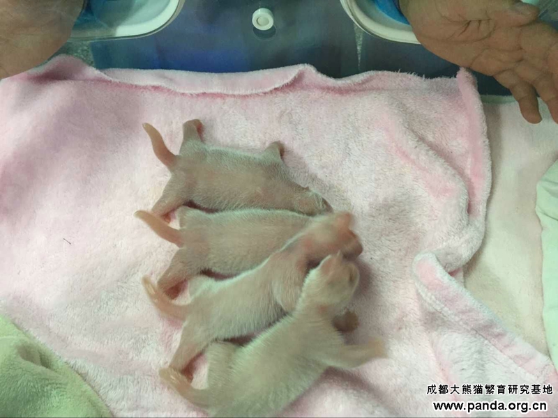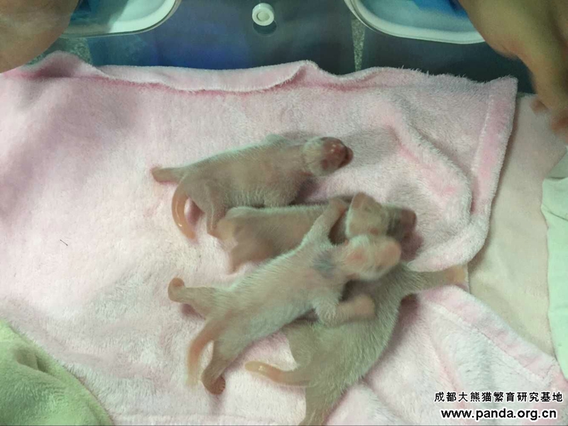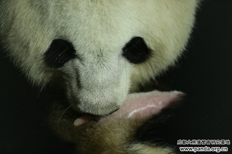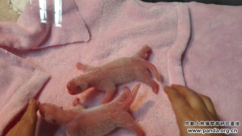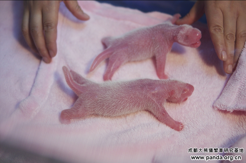 成都パンダ基地の専門家楊奎興氏の紹介によると、初出産の晶晶は7月1日から減食や、眠気や動きが少ないなどの症状が出始まり、7月27日からイライラしたり、木製の寝台を噛んだりするなどお産前の行為がありました。8月2日の朝4:10時に破水し始まり、5:40時に171.5グラムのオス双生児の兄を産んでから、6:12時にまた163.5グラムの弟を産みました。いま兄弟とも元気はつらつです。