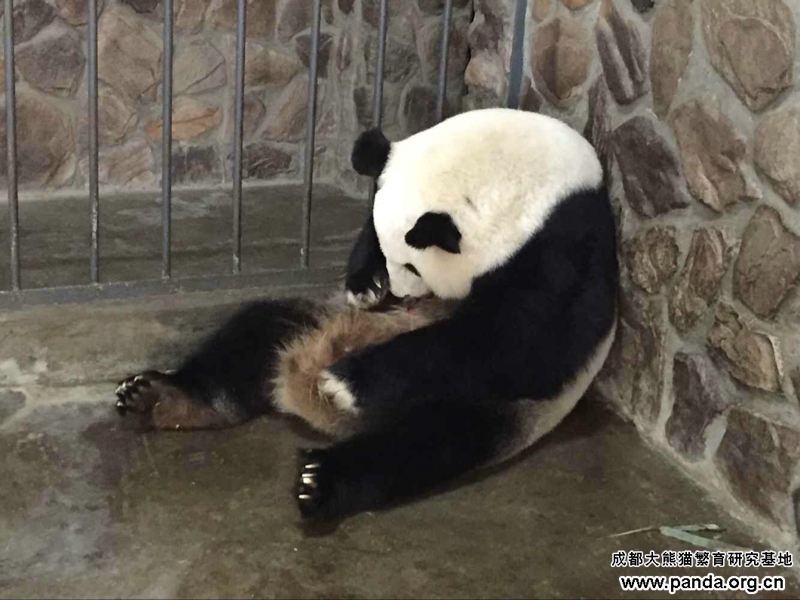 晶晶と比べて二回目の出産をする思縁も、7月1日から減食や、眠気や活動減少などの症状が出始まり、7月27日からイライラしたり、木製の寝台を噛んだりするなどお産前の行為がありました。8月2日の朝4:10時に破水し始まり、5:40時に171.5グラムのオス双生児の兄を産んでから、6:12時にまた163.5グラムの弟を産みました。いま兄弟とも元気はつらつです。