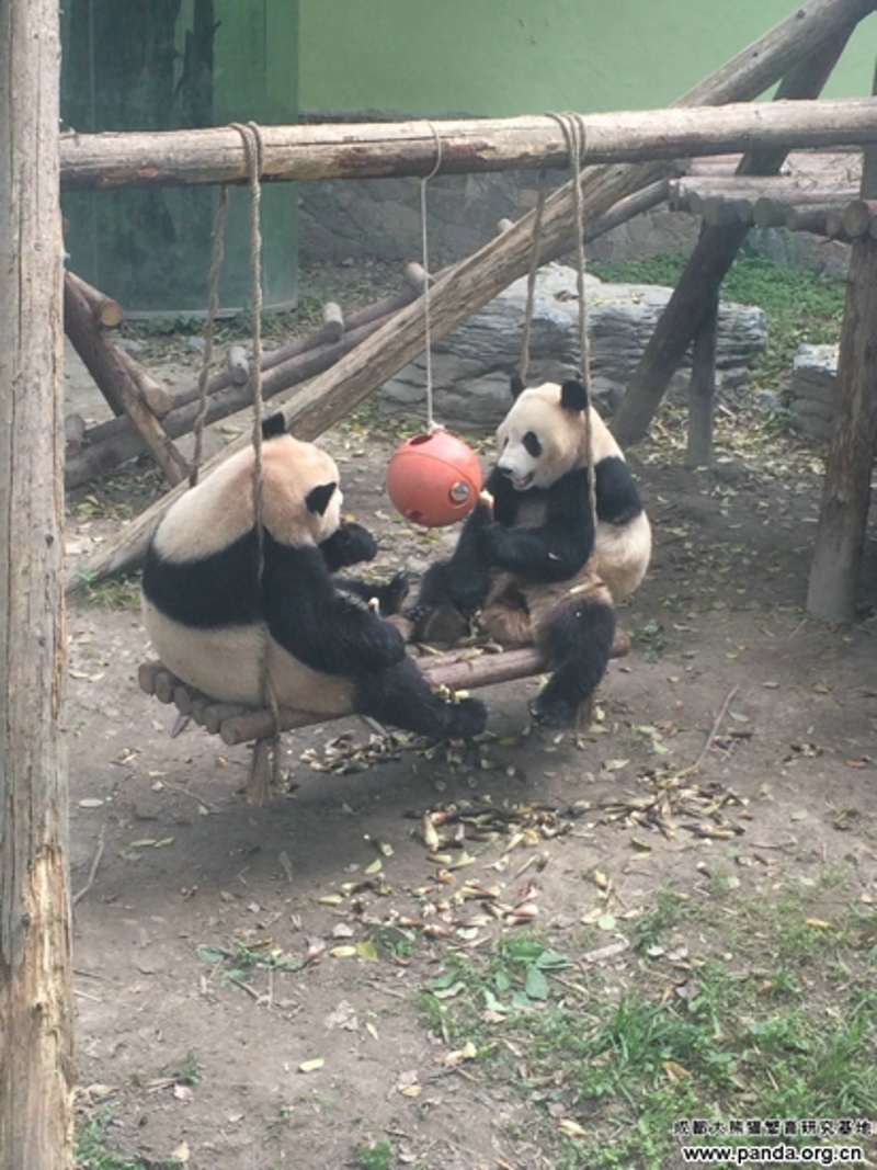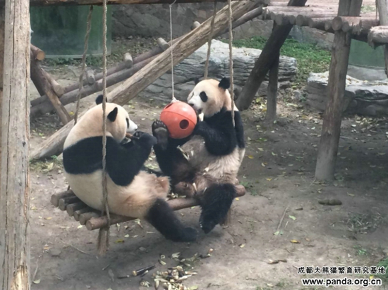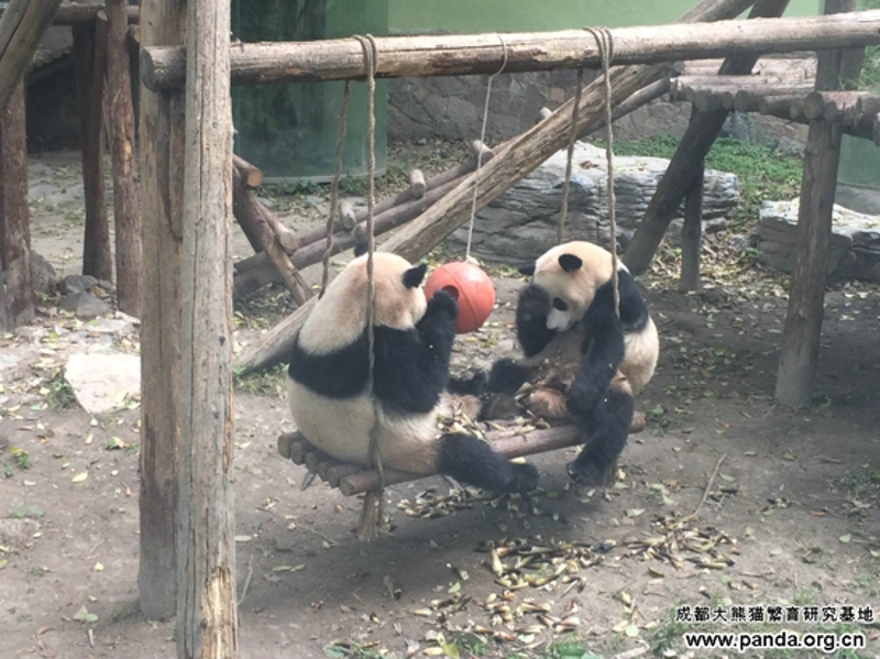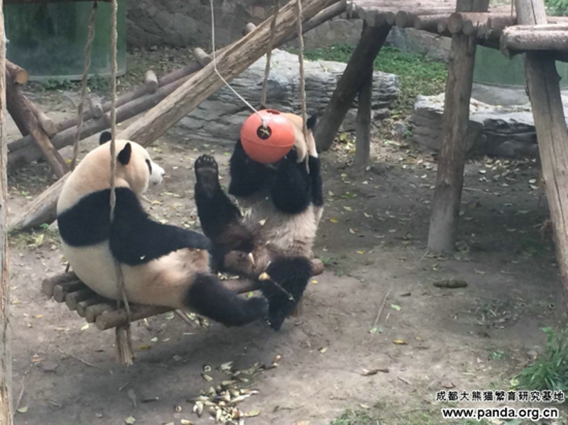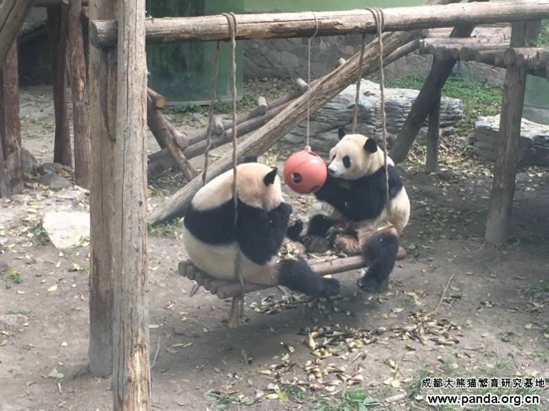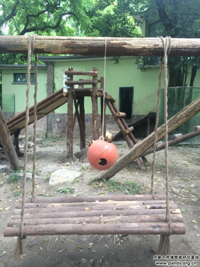 実は飼育員が出したこの赤ボールはパンダの食生活を豊富化するための一つの道具です。パンダに見たり、嗅いだり、回したり、噛んだりする方法でボールに隠された筍を探せて、取り出せることを通し、その体を鍛え、生活品質を向上する目的です。